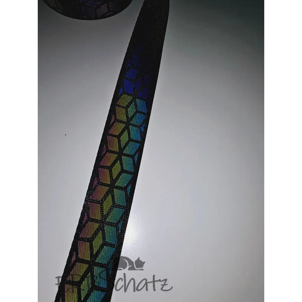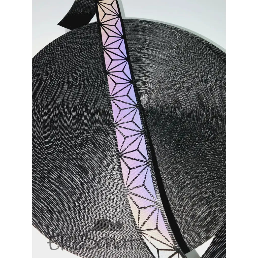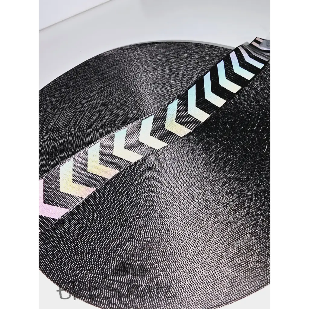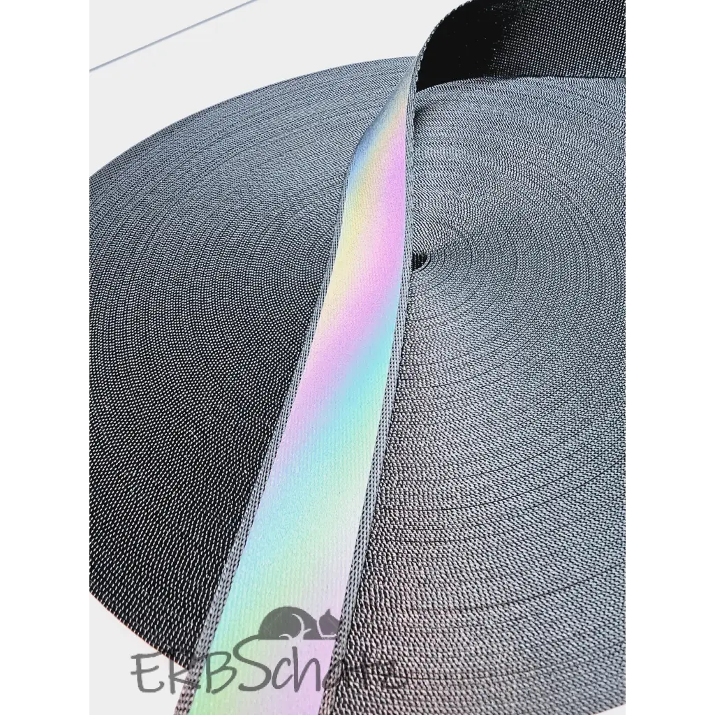 Polyester webbing in 25mm width with rainbow reflective designs. Ideal for quick, simple bag straps or smaller projects such as fanny packs and small shoulder bags.