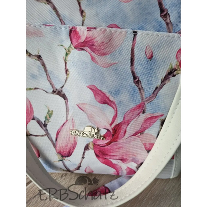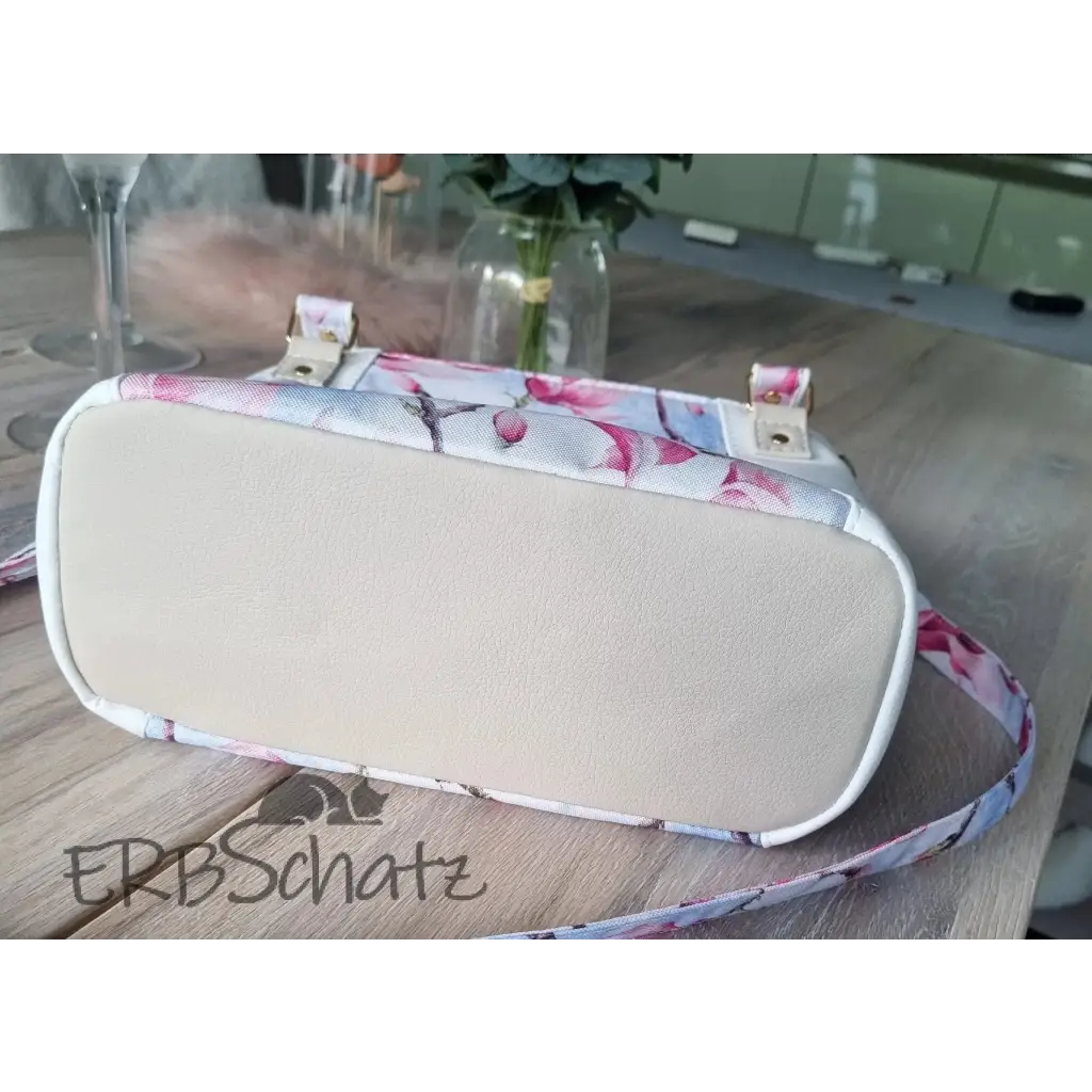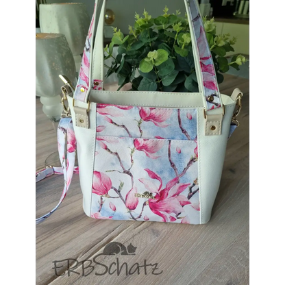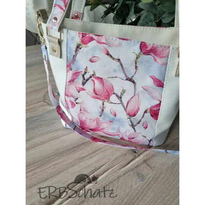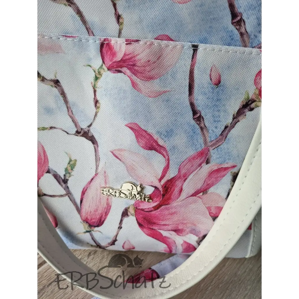 This beautiful handbag is a one-off and was handmade from white faux leather and a water-repellent canvas with a magnolia print. The magnolia design gives the handbag a flowery, fresh summer look - the golden metal buckles, carabiners and zips complement it in a harmonious and elegant way. The handbag has a large slide-in compartment secured with a magnetic clasp on the front part. The inner lining is made entirely of water-repellent canvas and, with a slide-in compartment and a zipped pocket, offers plenty of space for the necessary things and brings order to the handbag. With the shoulder straps, the bag can be carried comfortably over the shoulder or worn crossbody with the crossbody strap.