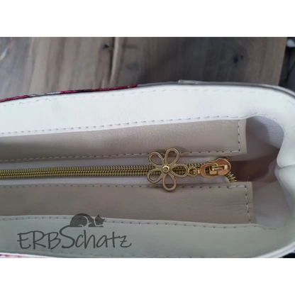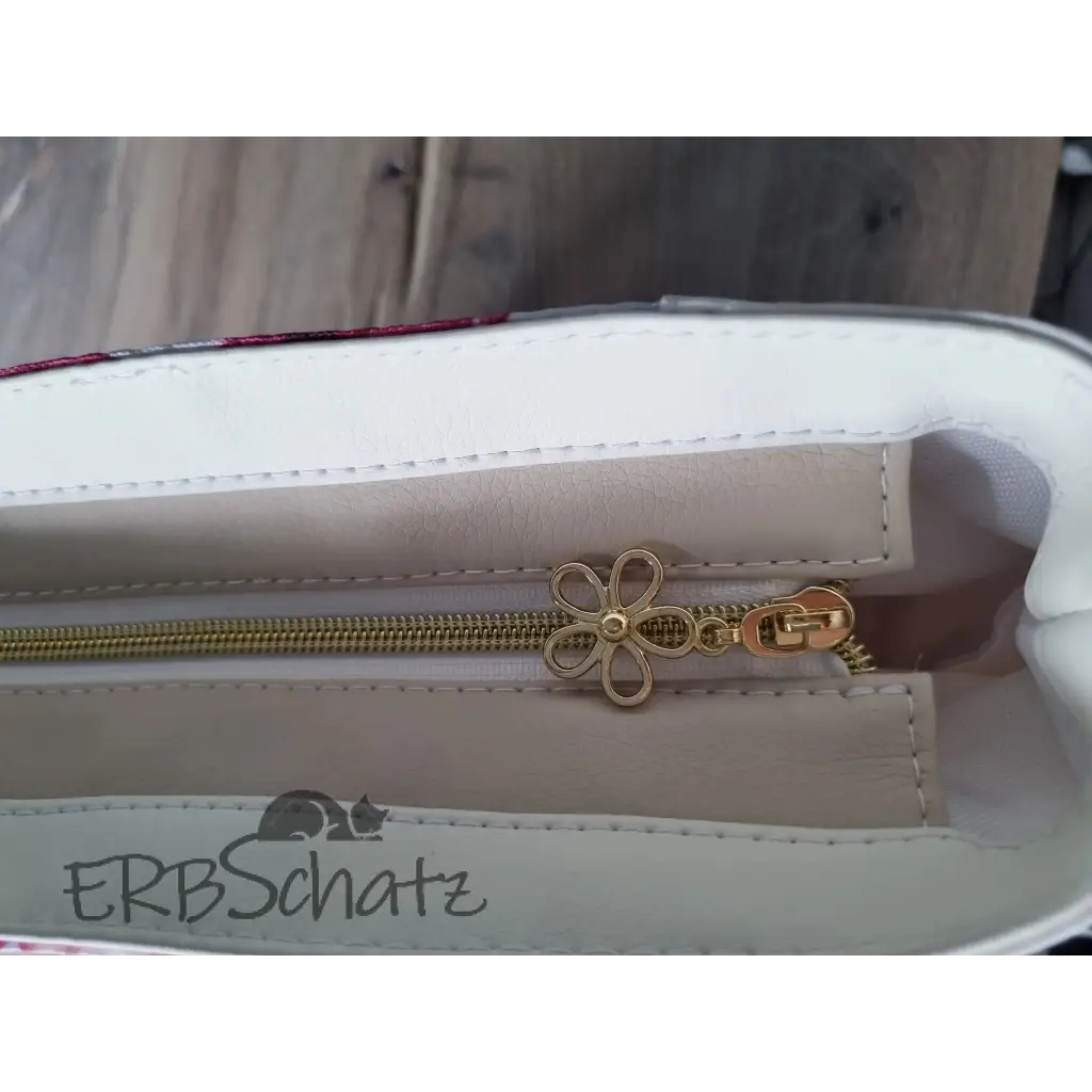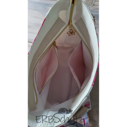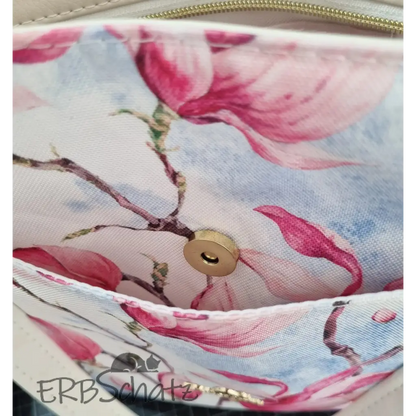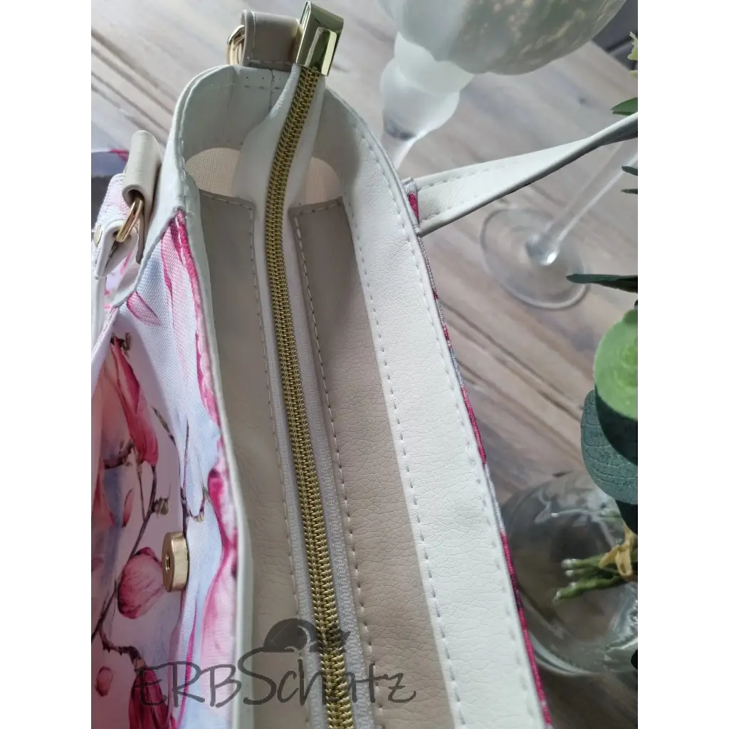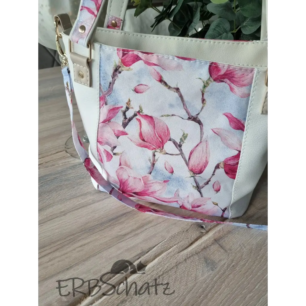 This beautiful handbag is a one-off and was handmade from white faux leather and a water-repellent canvas with a magnolia print. The magnolia design gives the handbag a flowery, fresh summer look - the golden metal buckles, carabiners and zips complement it in a harmonious and elegant way. The handbag has a large slide-in compartment secured with a magnetic clasp on the front part. The inner lining is made entirely of water-repellent canvas and, with a slide-in compartment and a zipped pocket, offers plenty of space for the necessary things and brings order to the handbag. With the shoulder straps, the bag can be carried comfortably over the shoulder or worn crossbody with the crossbody strap.