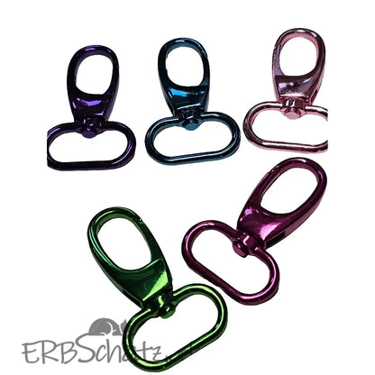 Shapely carabiners for use with 25mm webbing. These carabiners are outstanding in color in beautiful metallic colors pink, purple, blue or green - give your bag the perfect touch of color and combine it with the matching D-rings, rivets, zippers and endless zips here from the shop.