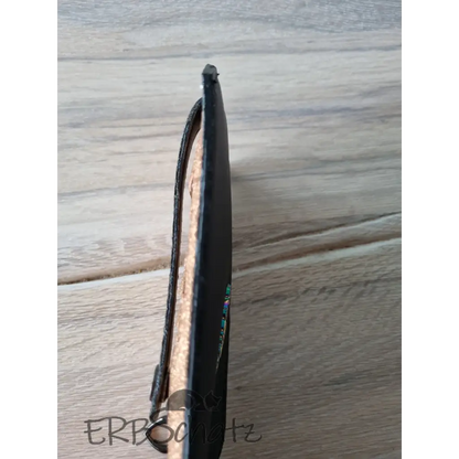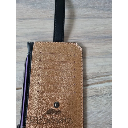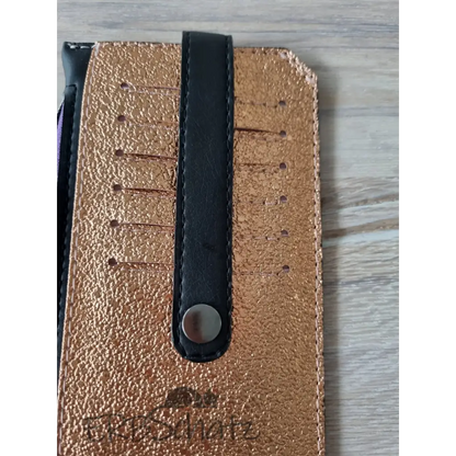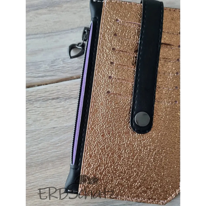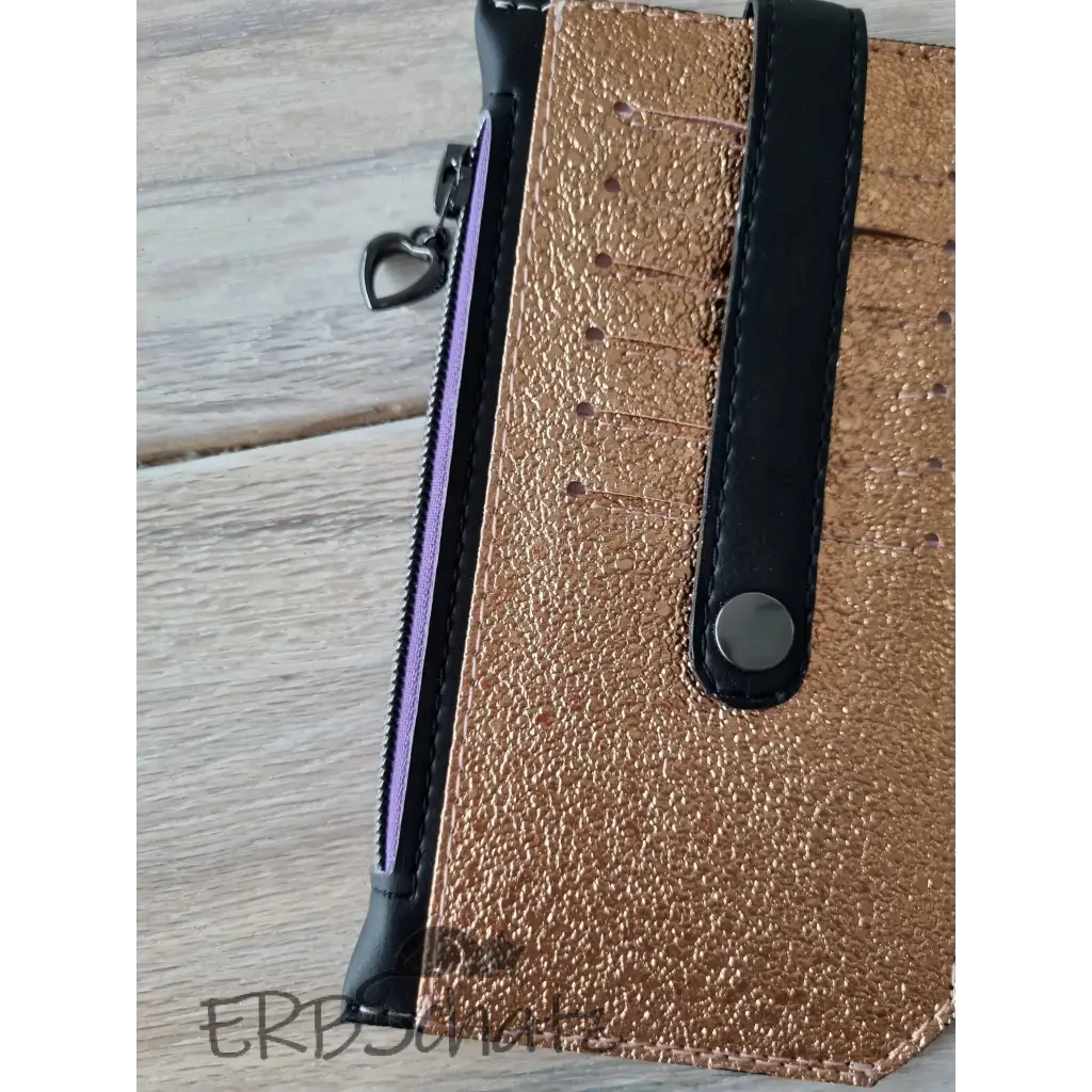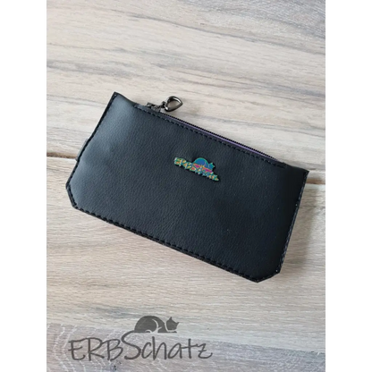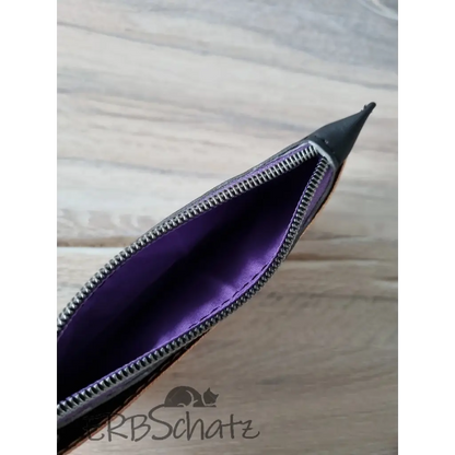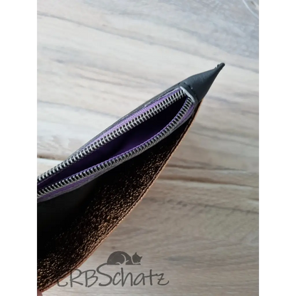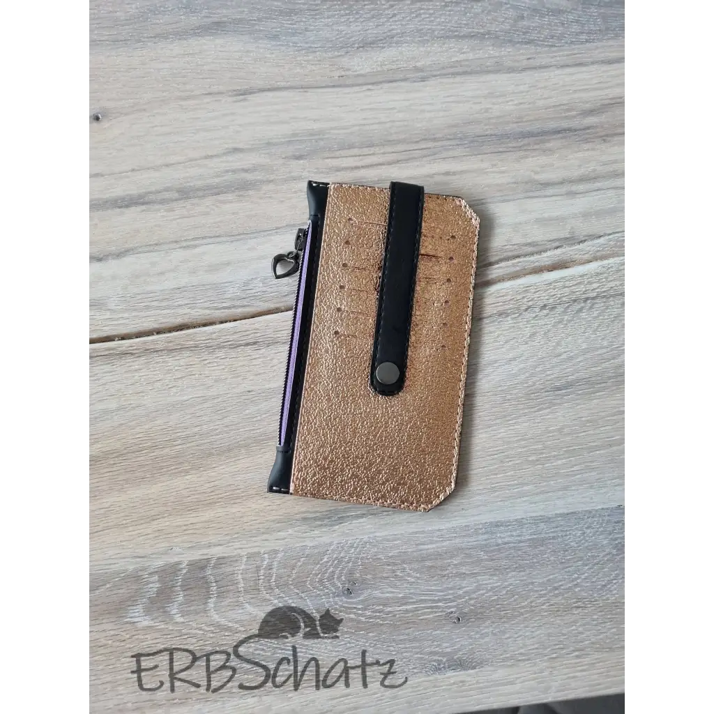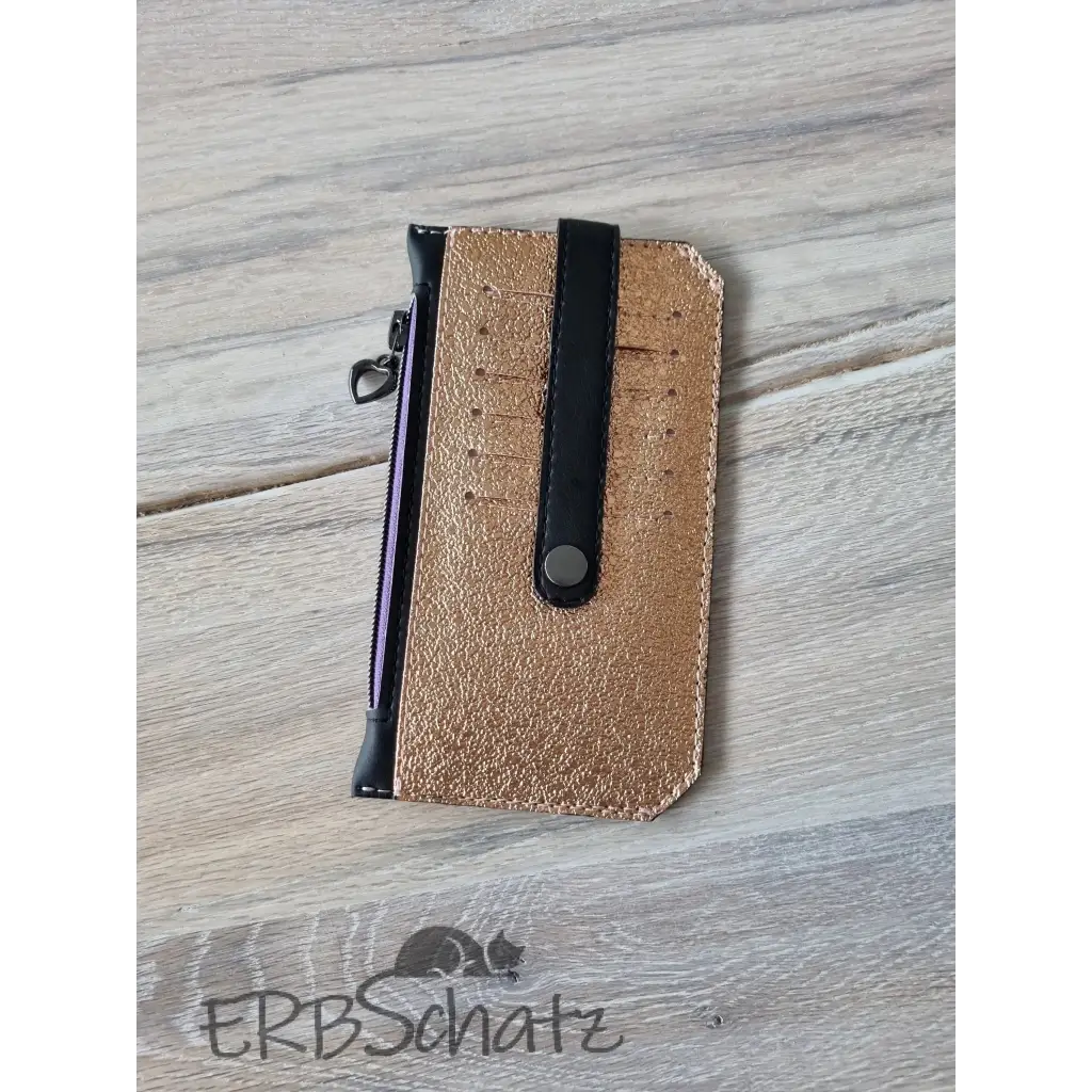 This beautiful flat wallet in fine black and copper-colored embossed imitation leather was handmade with a lot of love. It has 6 card slots, a zip pocket and a slip pocket, offers space for small change and bills and is still nice and flat and doesn't take up much space in the bag. The 6 credit card slots are secured with a snap fastener. The imitation leather edges were sealed by hand with Edgepaint and give the wallet a more elegant look.
