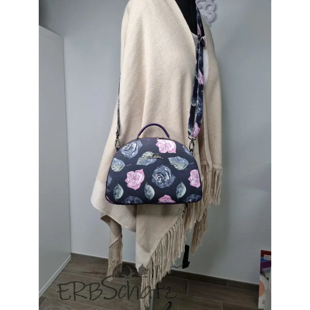 Kleine Bowlerbag mit einzigartigem Flieder und Augergine Rosenmotiv. Diese auffällige handgearbeitete Handtasche im Bowlerbagstyle wurde aus lilafarbenem Kunstleder mit Metallicschimmer in Kombination mit einem Canvas mit Rosenund Blätterdruck handgefertigt. Die Gun-Metal-farbenen Zipper und Metallteile veredeln den stylischen Look. Das Innenfutter der Tasche ist aus wasserfestem Canvas gefertigt - die Tasche ist klein aber innen doch geräumig und bietet Platz für alles was Frau so dabei haben muss. Auf beiden Seiten der Tasche sind je zwei Steckfächer um Sachen sortiert unterzubringen. Die Tasche hat auf der Unterseite Taschenfüßchen, damit sie beim Abstellen nicht verschmutzt. Alles in allem eine sehr edle und vor allem einzigartige Tasche - wie immer bei Erbstück ein Unikat!