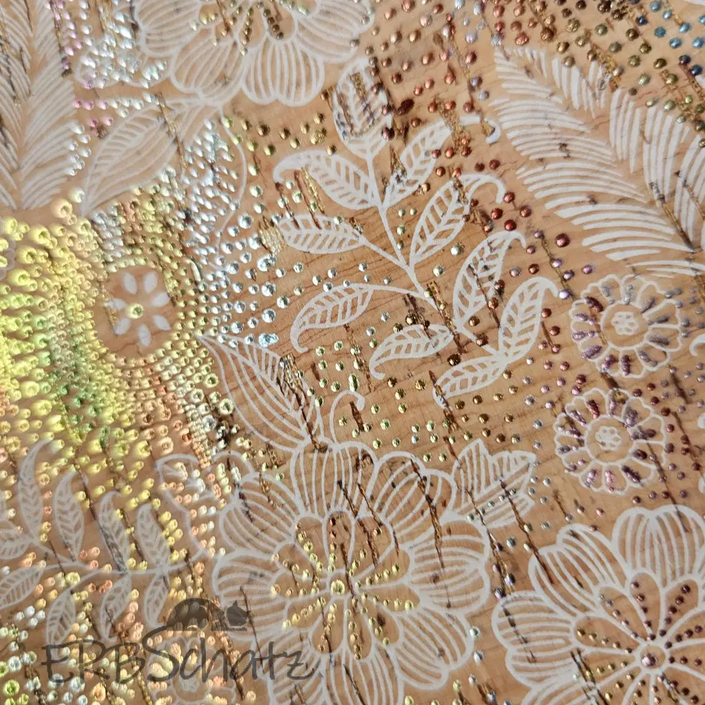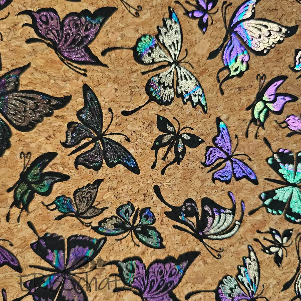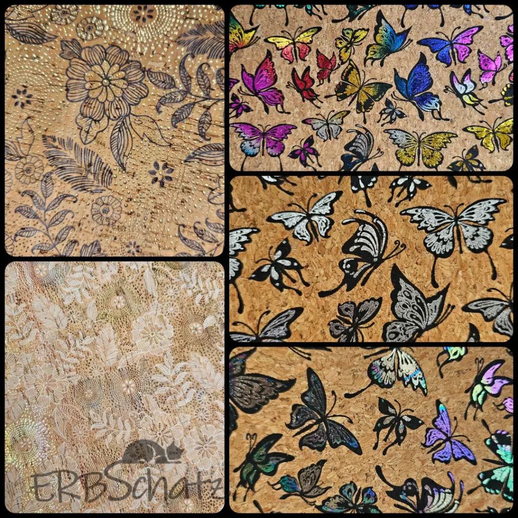 Schöner dünner Korkstoff mit wundervolle Designs, ob mit schillernden Schmetterlingen oder Kunstvollem Blumendesign, in jedem Fall ein echter Hingucker! Textilrückseite, sehr geschmeidig und toll zu vernähen - sollte auf jeden Fall verstärkt werden!