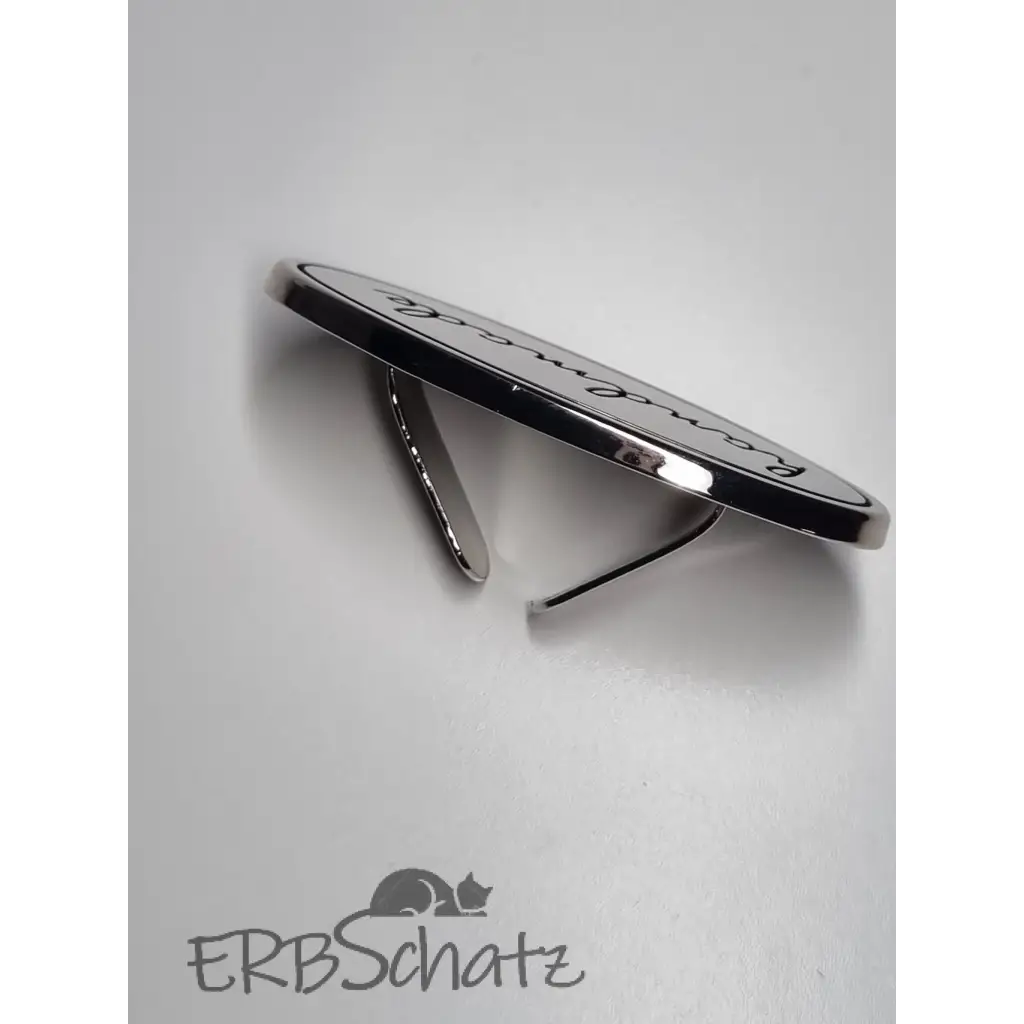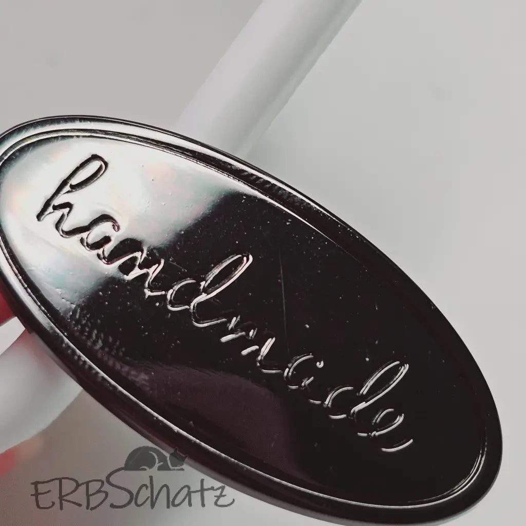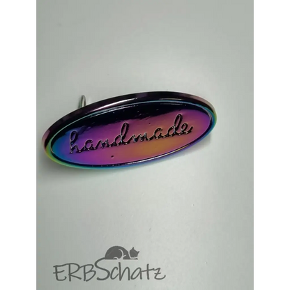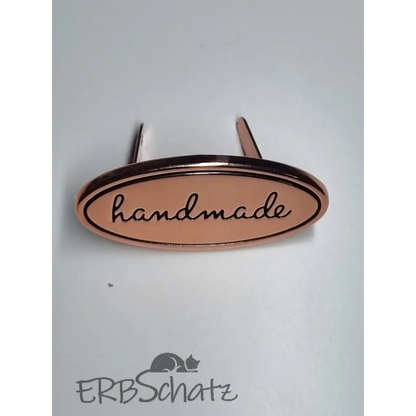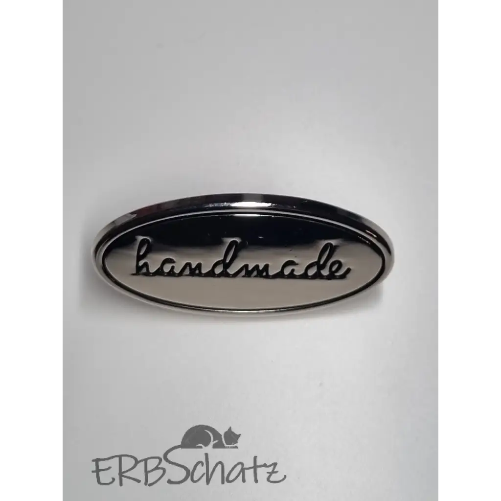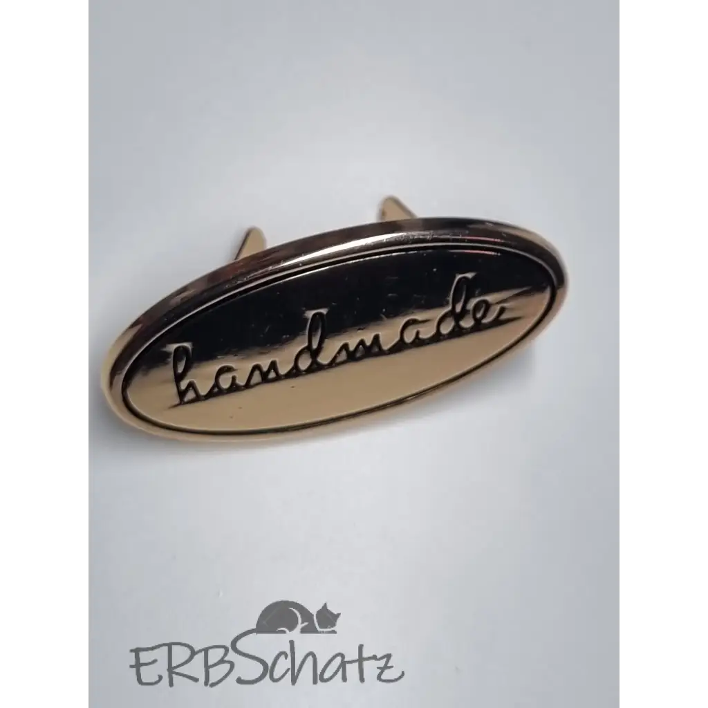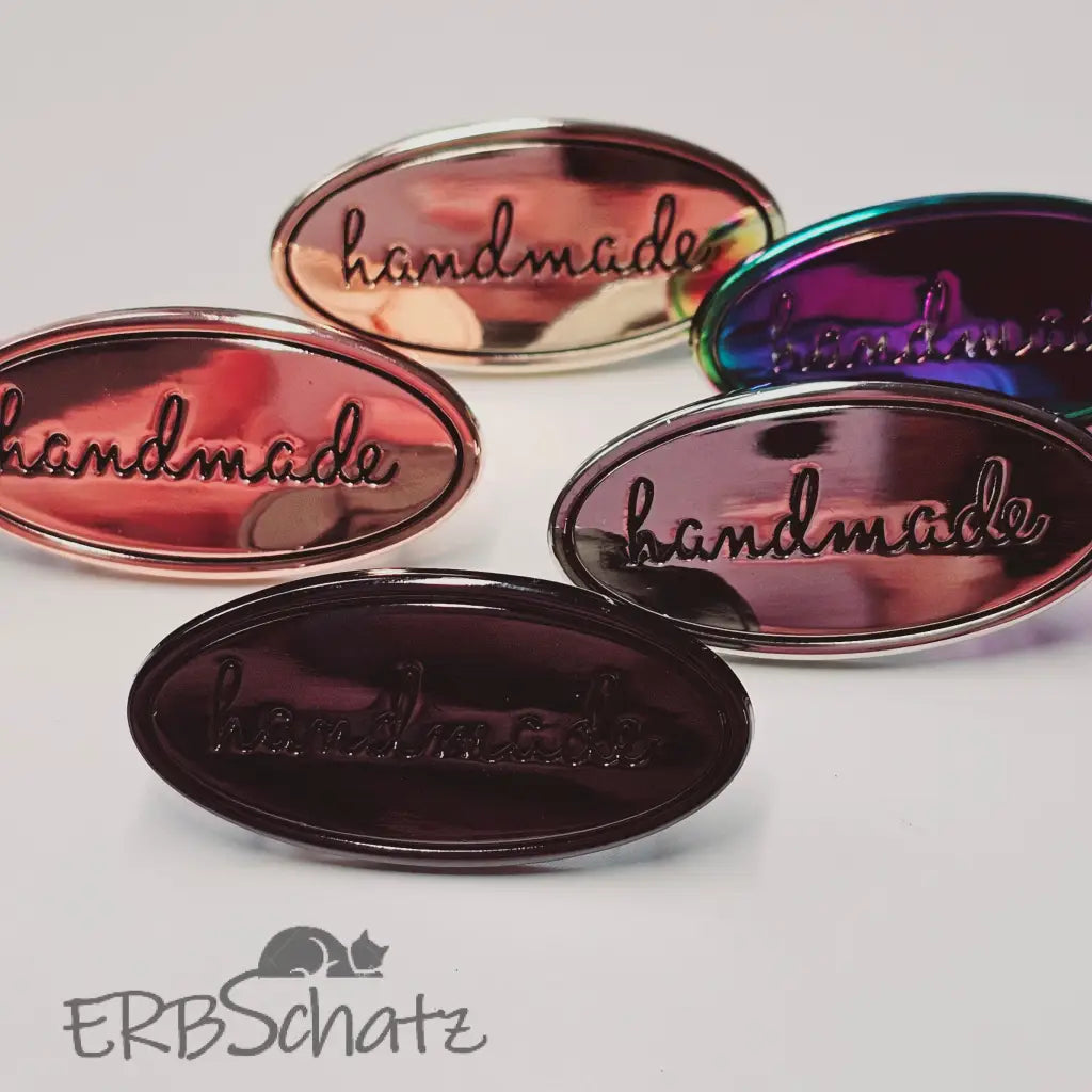 Metall Label mit Aufschrift "Handmade" in verschiedenen Farben und Formen.