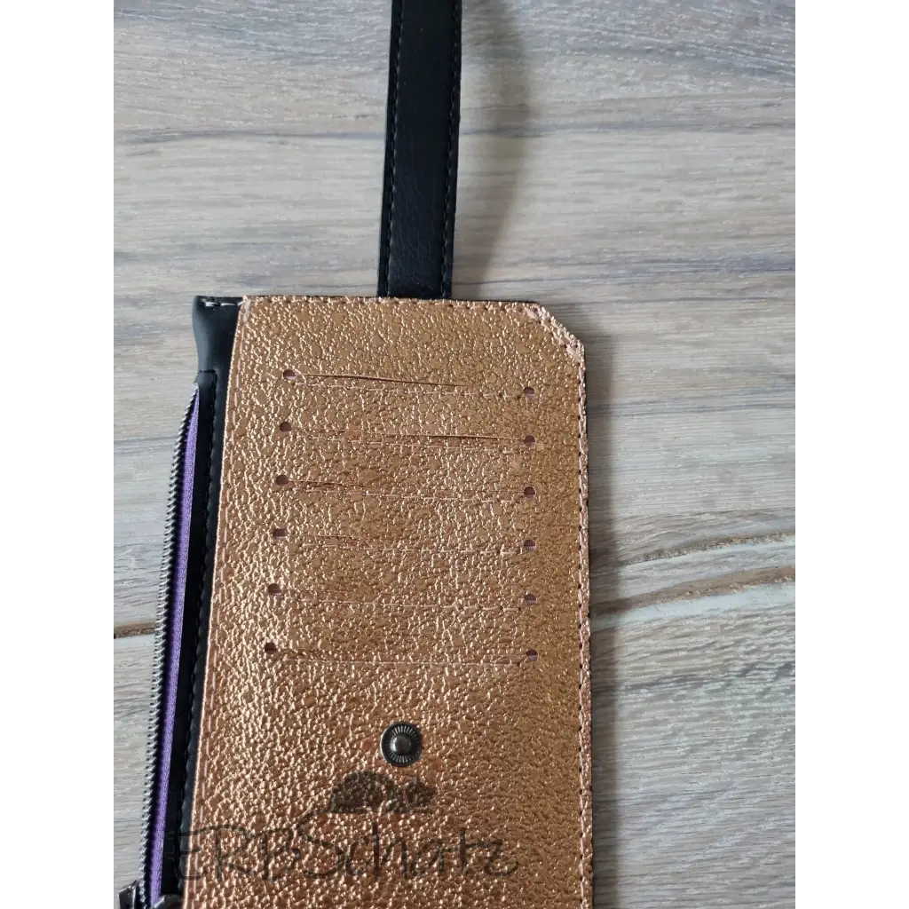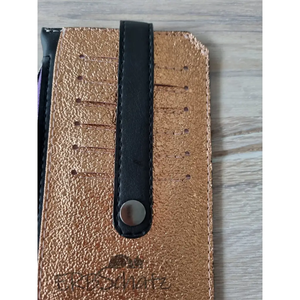 Dieses schöne flache Portemonnaie in edlem schwarzen und kupferfarbenem geprägtem Kunstleder wurde mit viel Liebe handgefertigt. Es hat 6 Kartenfächer , ein Reißverschlussfach und ein Steckfach, bietet Platz für Kleingeld und auch Scheine und ist dennoch schön flach und nimmt nicht viel Platz in der Tasche weg. Die 6 Kreditkartenfächer werden mit einem Druckknopfverschluß gesichert. Die Kunstlederkanten wurde von Hand mit Edgepaint versiegelt und geben dem Portemonnaie so einen edleren Look.