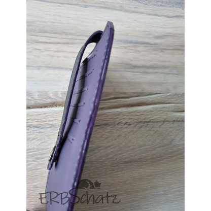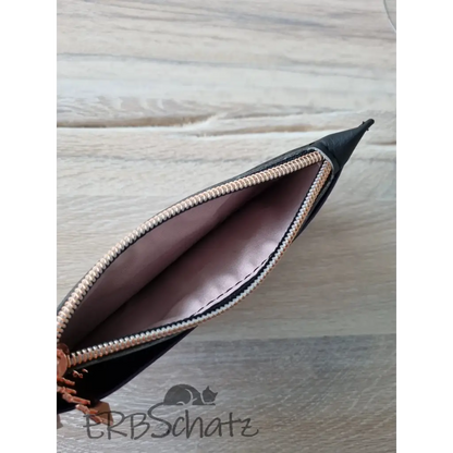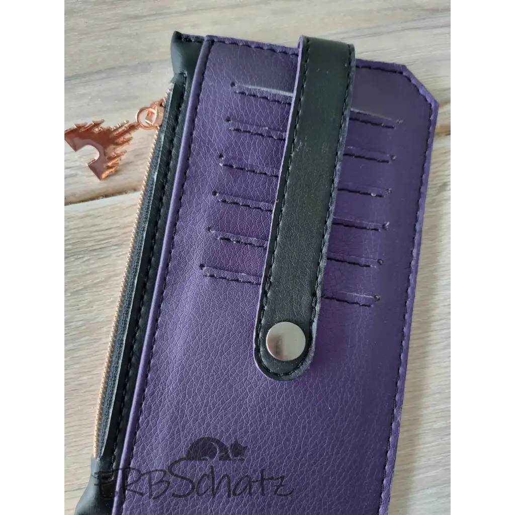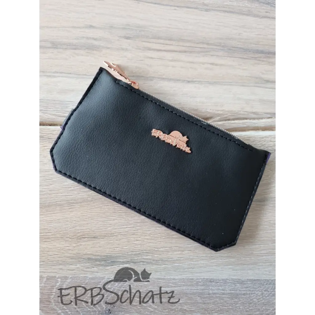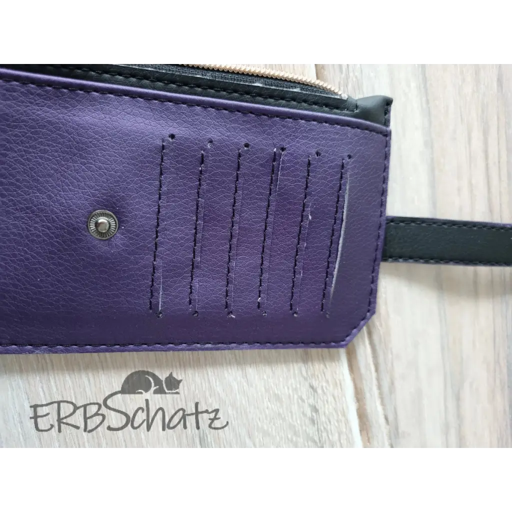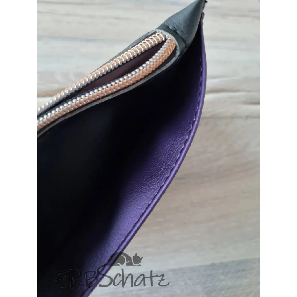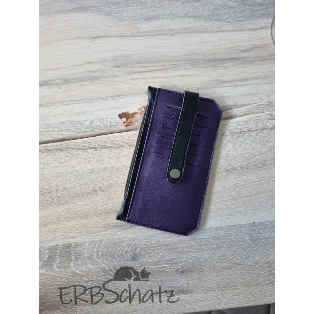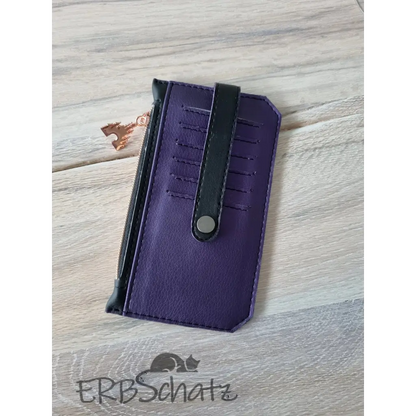 Dieses schöne flache Portemonnaie in edlem schwarzen und lilafarbenem (mit Seidenschimmer) Kunstleder wurde mit viel Liebe handgefertigt. Es hat 6 Kartenfächer , ein Reißverschlussfach und ein Steckfach, bietet Platz für Kleingeld und auch Scheine und ist dennoch schön flach und nimmt nicht viel Platz in der Tasche weg. Die 6 Kreditkartenfächer werden mit einem Druckknopfverschluss gesichert. Die Kunstlederkanten wurde von Hand mit Edgepaint versiegelt und geben dem Portemonnaie so einen edleren Look.