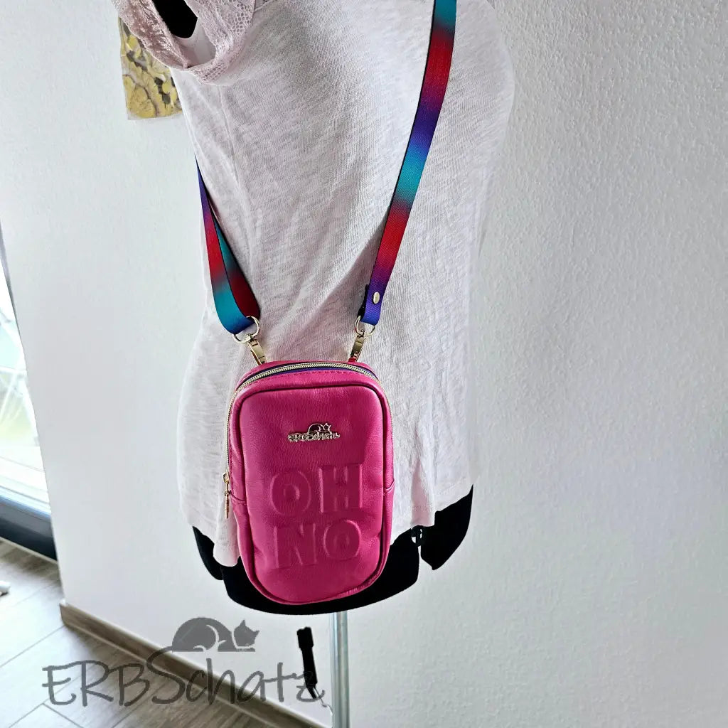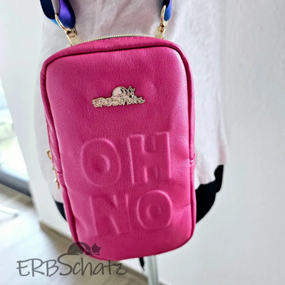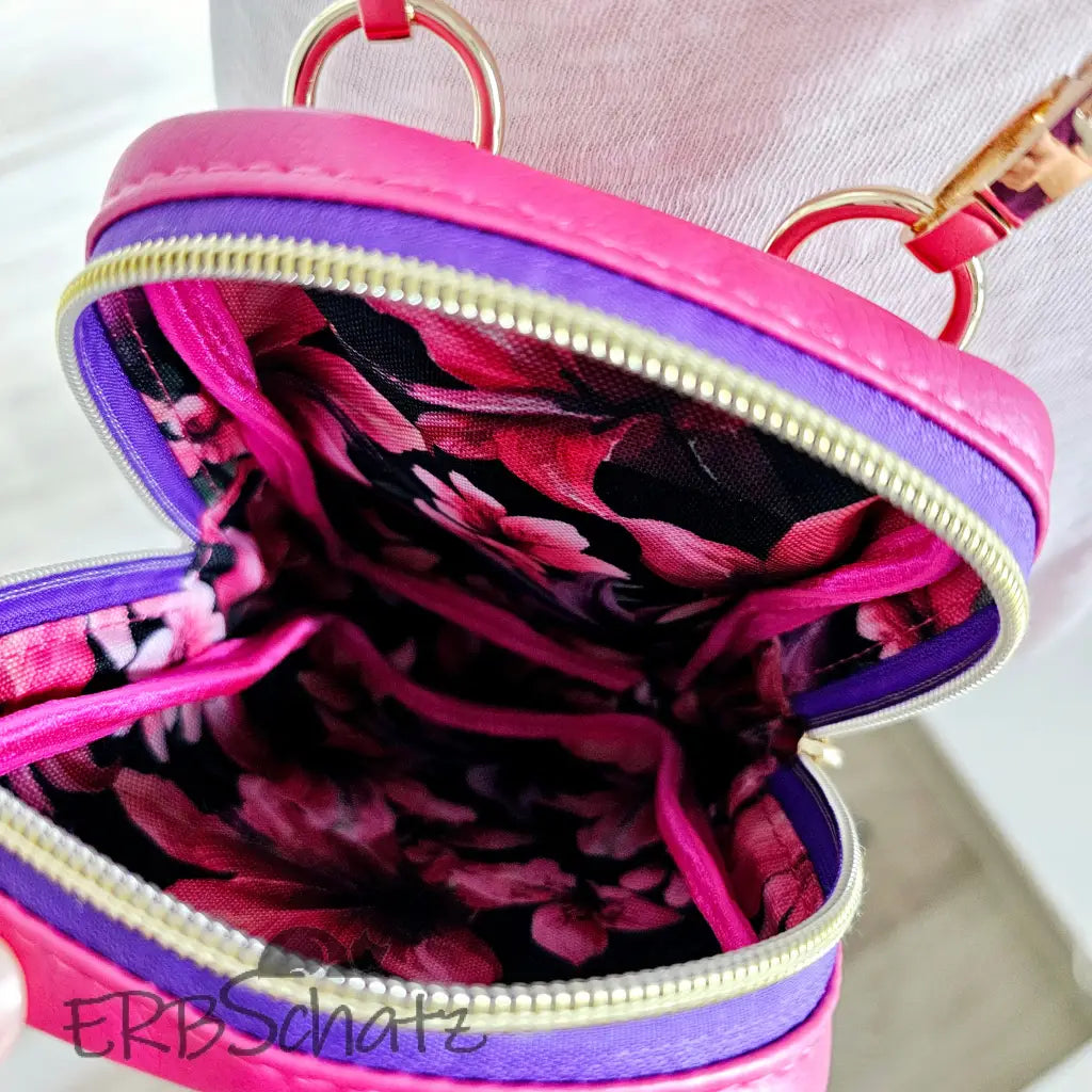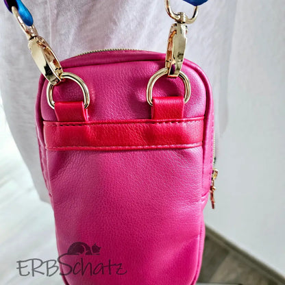 Handgefertigte Smartphone Tasche edlem Pink metallic Kunstleder und Trapunto Verzierung. Diese schöne kleine Smartphone Tasche ist klein und minimalistisch gestaltet - dennoch groß genug, um Dein Smartphone und ein paar weitere Kleinigkeiten darin unterzubringen. Die Tasche ist außen komplett aus Kunstleder gefertigt und wird mit einem Reißverschluss sicher verschlossen. Das schöne farblich passende Gurtband, sowie Hardware und Design Zipper in edlem Gold runden das schöne Design ab.