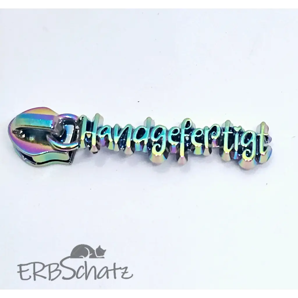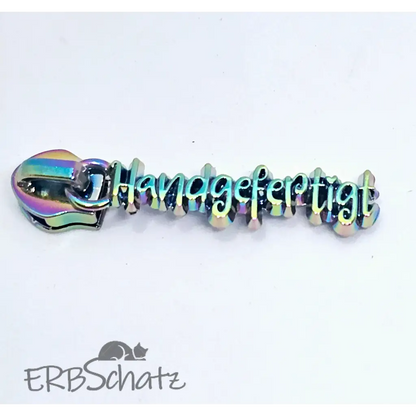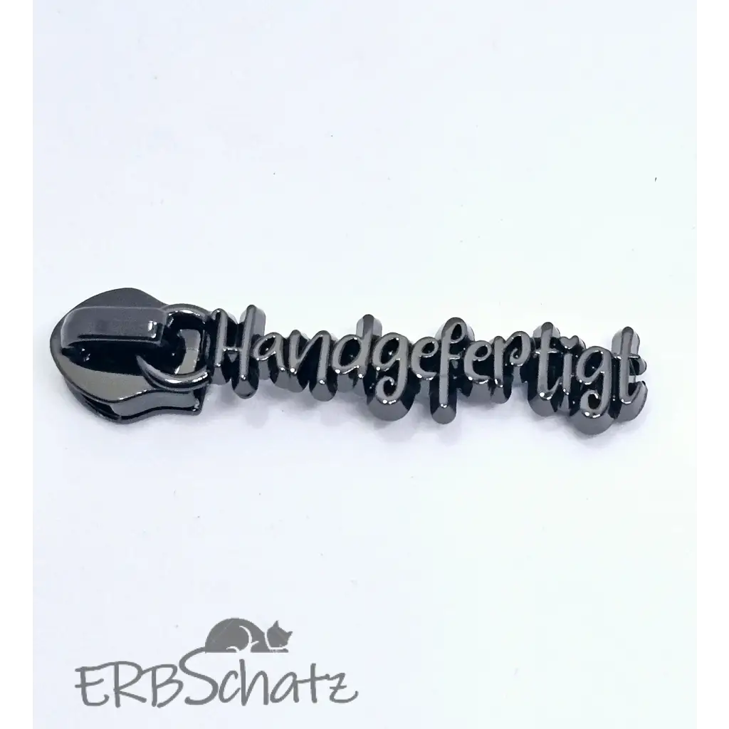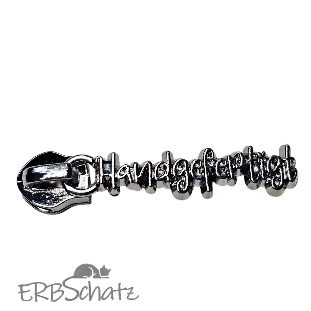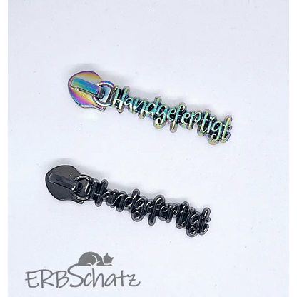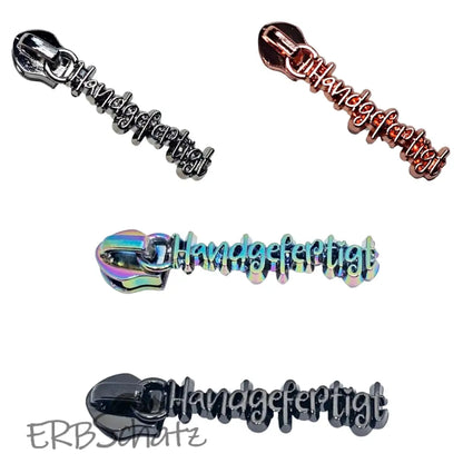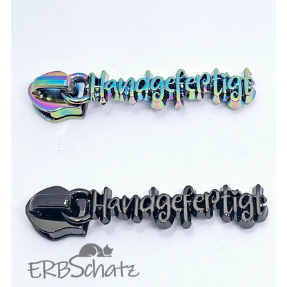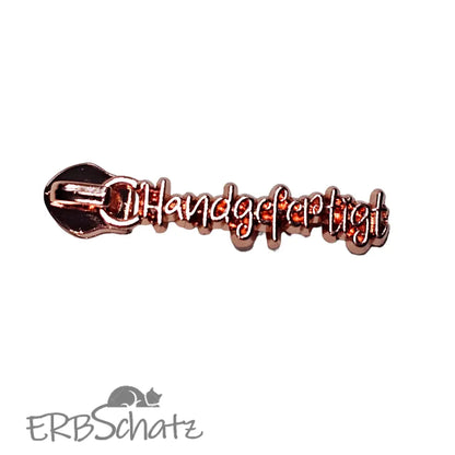 Statement Zipper "Handgefertigt" in schöner Schrift - fein ausgearbeitet von vorne und hinten hübsch. Geeignet für RV #5. Farben zur Auswahl.